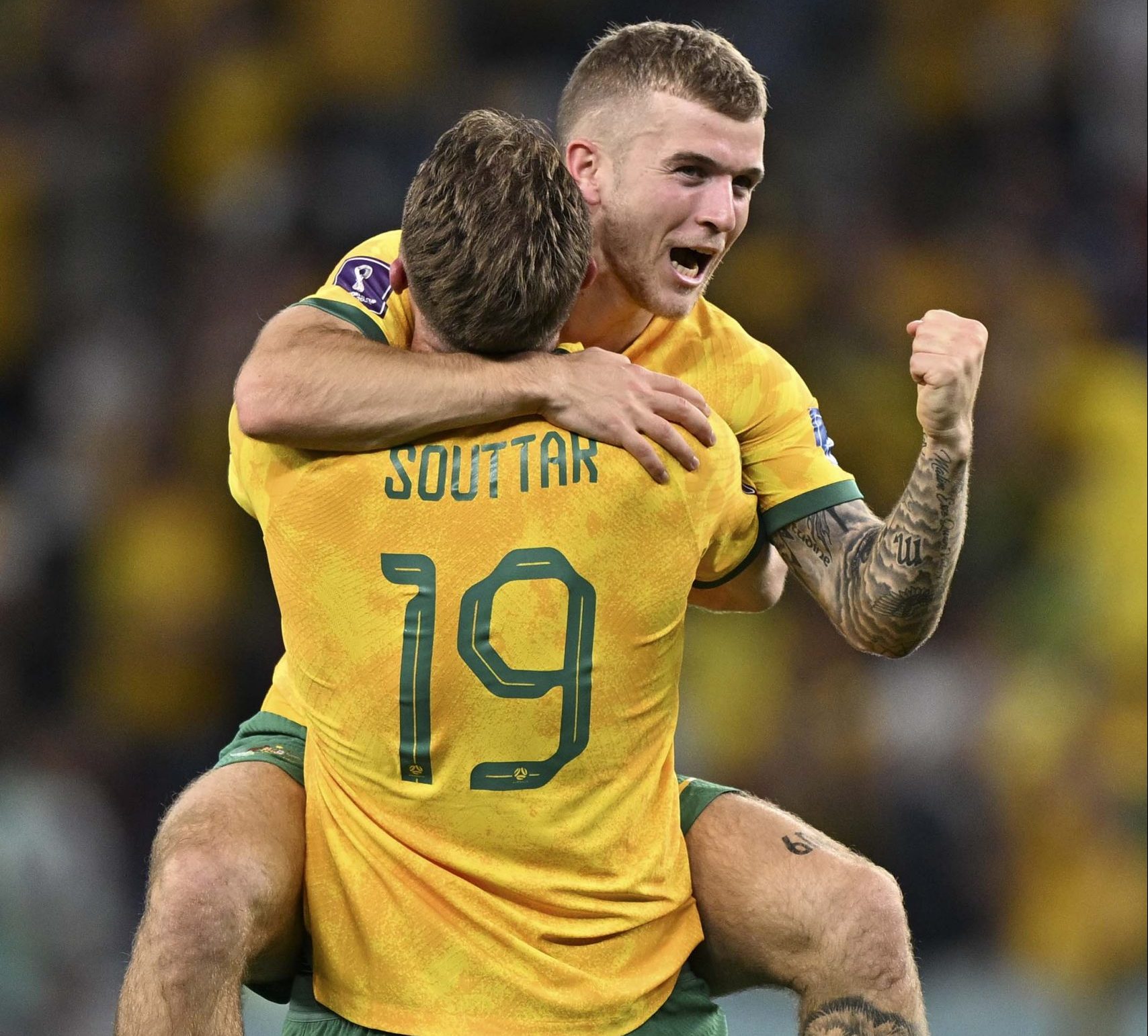 (221130) — AL WAKRAH, Nov. 30, 2022 (Xinhua) — Harry Souttar (front) and Riley McGree of Australia celebrate after the Group D match between Australia and Denmark at the 2022 FIFA World Cup at Al Janoub Stadium in Al Wakrah, Qatar, Nov. 30, 2022. (Xinhua/Xin Yuewei)