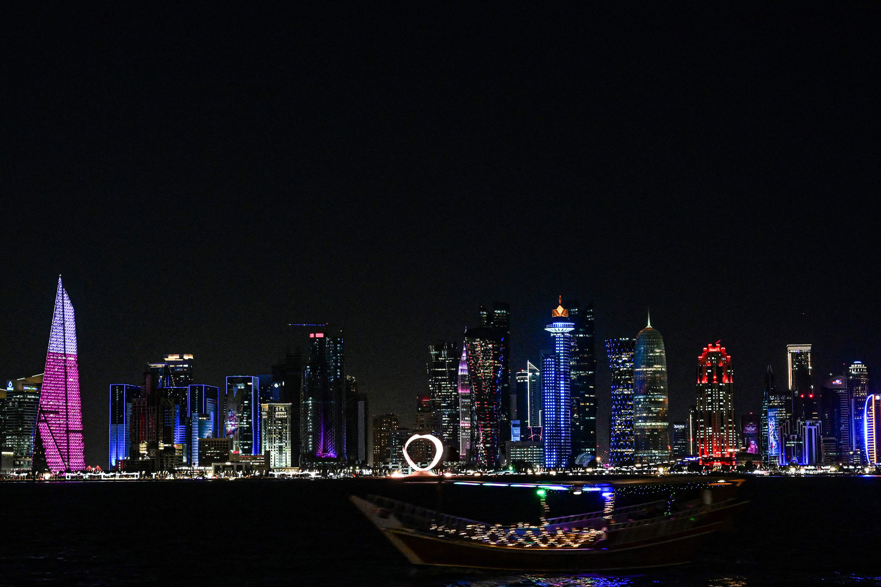 A traditional dhow boat sails in front of Doha’s skyline on November 28, 2022 during the Qatar 2022 World Cup football tournament. (Photo by MIGUEL MEDINA / AFP)