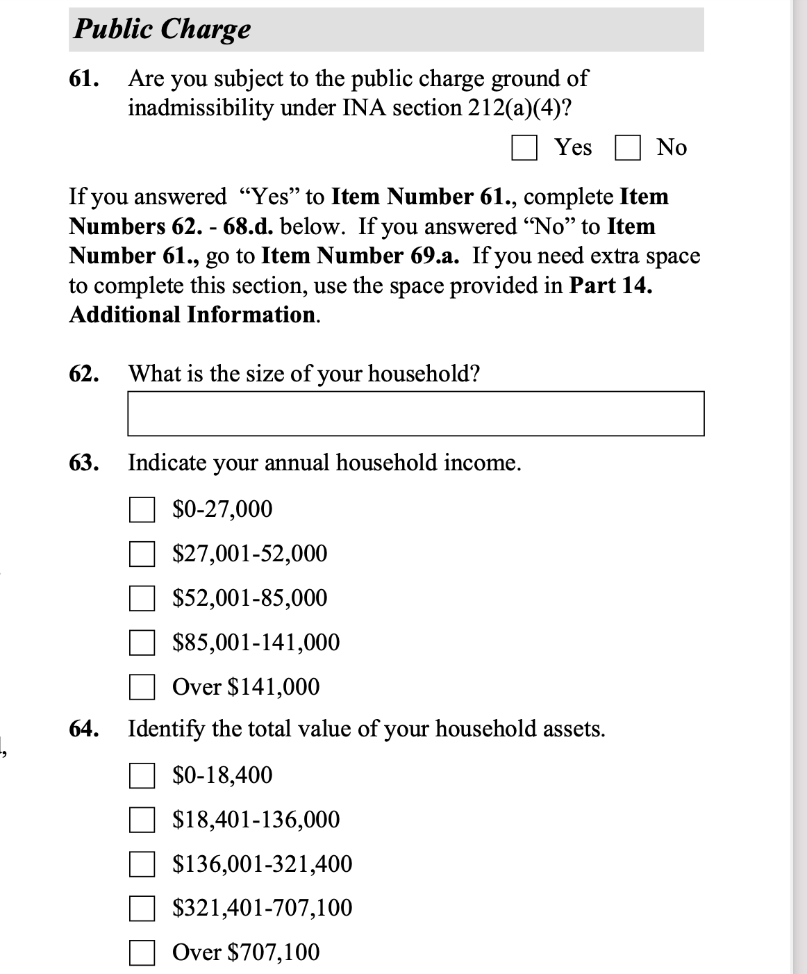तर नयाँ फर्ममा भने पब्लिक चार्जमा पर्ने नपर्ने सिधा प्रश्न गर्दै यदि पर्ने देखिएको खण्डमा परिवारको आकार, परिवारको बार्षिक आम्दानी, कुल सम्पत्तिको मूल्य, परिवारको दायीत्व रकम, आफ्नौ शैक्षिक योग्यता, प्रमाणपत्र, इजाजतपत्र, कार्य अनुभव मार्फत प्राप्त कौशल लगायतका विवरणहरु भर्नुपर्नेछ । साथै सप्लीमेन्टल सेक्युरिटी इन्कम, खाँचोमा परेका परिवारहरूको लागि अस्थायी सहायता प्राप्त गरे नगरेको पनि जानकारी दिनुपर्नेछ ।
