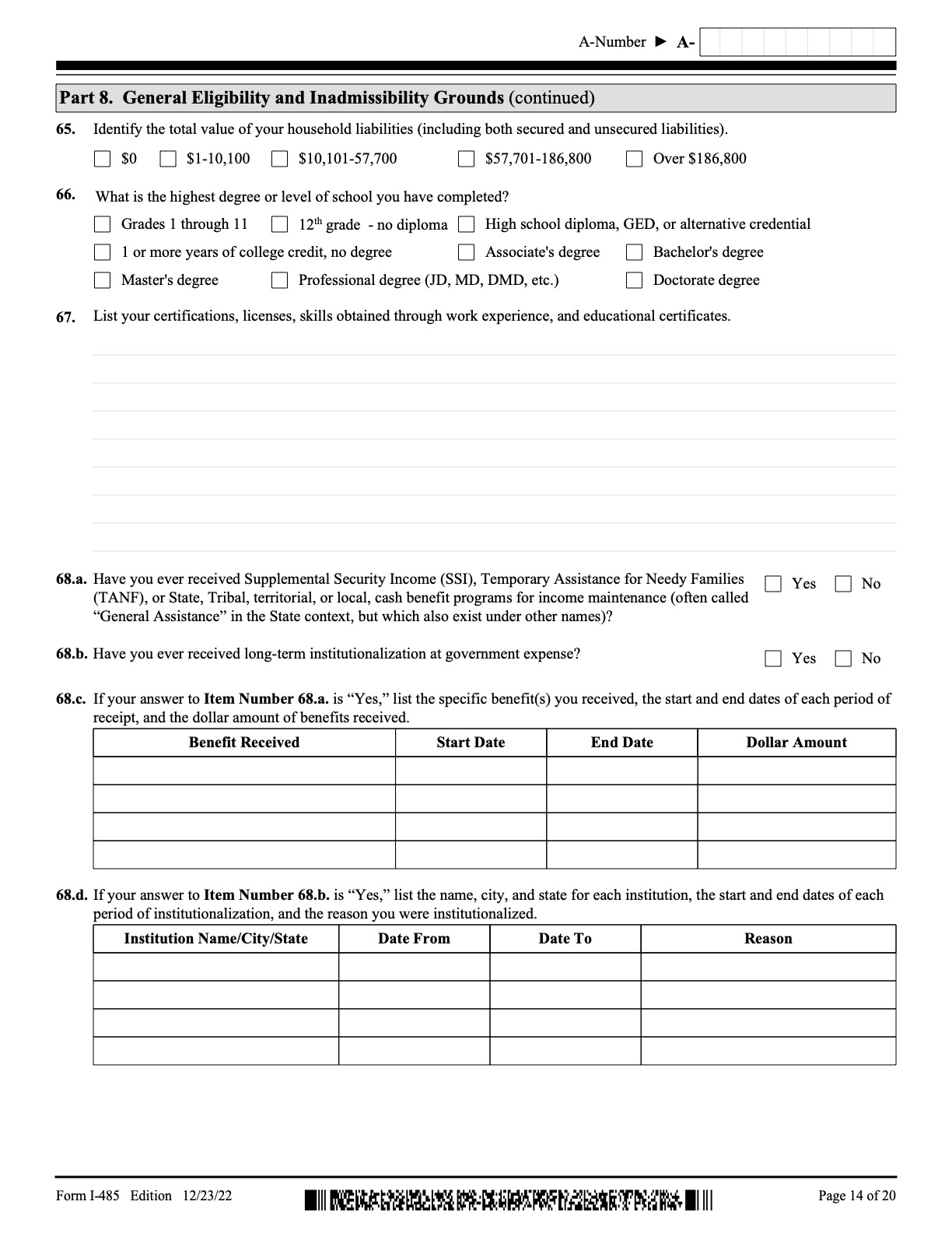 पूरानो आई ४८५ आवेदन १८ पेजको रहेको छ भने नयाँ आवेदन २० पेजको रहेको छ । सामान्य योग्यता र अस्वीकृतिका आधारको प्रश्न ६१ मा अहिलेको फर्ममा अमेरिकामा अमेरिकी सरकार वा कुनै पनि राज्य, काउन्टी, शहर, वा नगरपालिकाबाट कुनैपनि श्रोतबाट सरकारी सुविधा लिएको नलिएकोबारे प्रश्न रहेको छ भने ६२ मा लिने सम्भावना भए नभएकोबारे प्रश्न सोधिएको छ ।