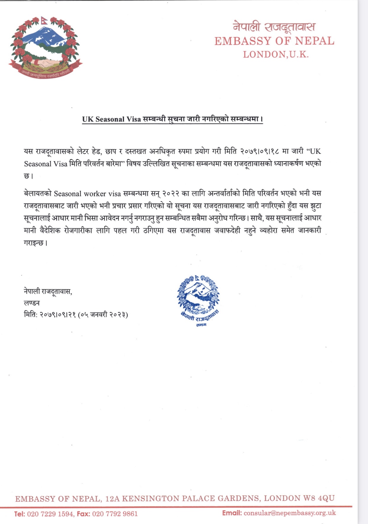 गत पौष १८ गतेका दिन ‘यूके सिजनल भिसा मिति परिवर्तनबारेमा’ भन्दै दूतावासको लेटरहेड, छाप र दस्तखतसहितको एक फर्जी सूचना प्रकाशित भएको थियो ।