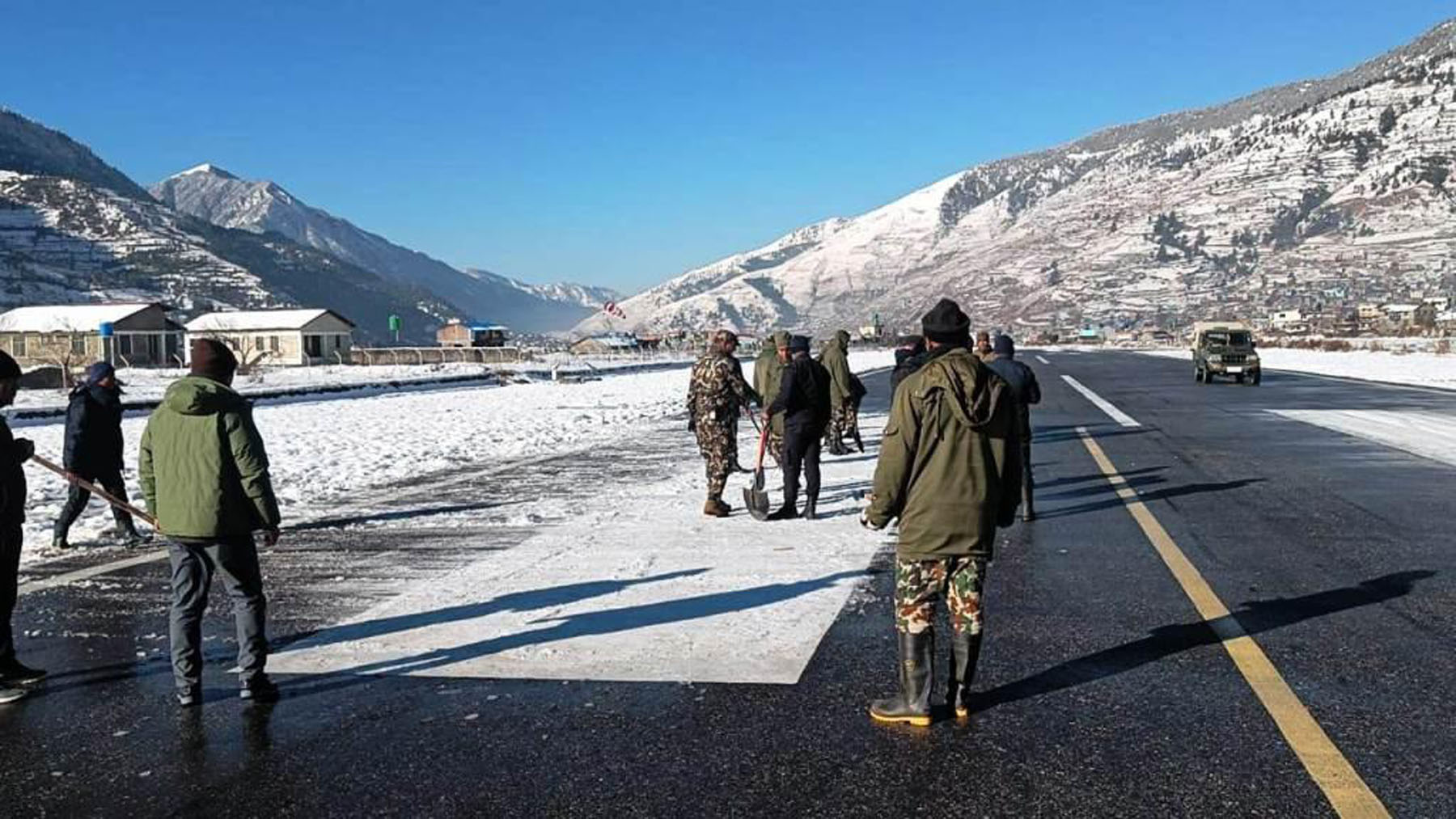दुई दिन परेको हिउँले विमानस्थलको धावनमार्गमा हिउँ जमेपछि हवाई सेवा ठप्प भएको थियो । निमित्त कार्यालय प्रमुख श्रेष्ठले भन्नुभयो, “आजका लागि दुई वटा मात्रै उडान भएको छ ।” विमानस्थलभित्रको धावनमार्गमा जमेको हिउँ फालेपछि जुम्लाका लागि हवाई सेवा सञ्चालनमा आएको नेपाली सेना नन्दबक्स गण जुम्लाका गणपति रवीन थापाले बताउनुभयो ।