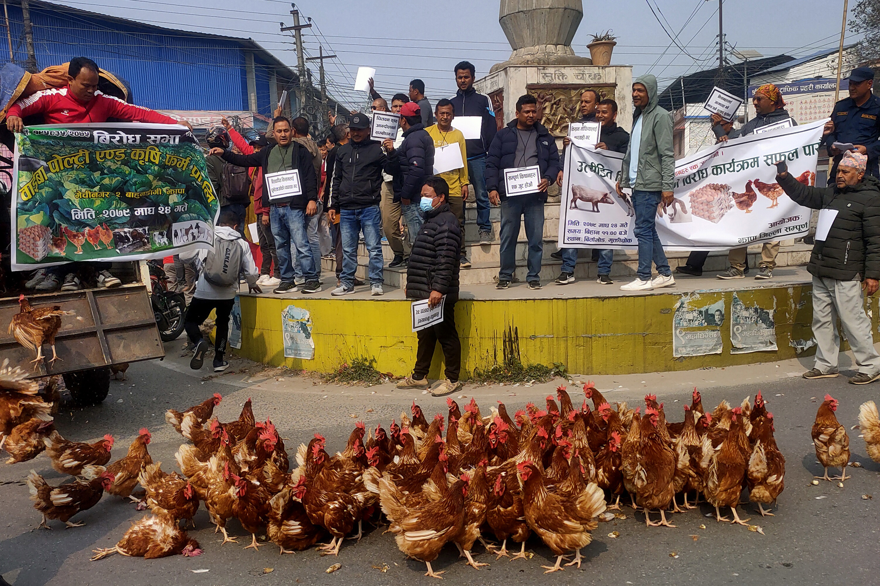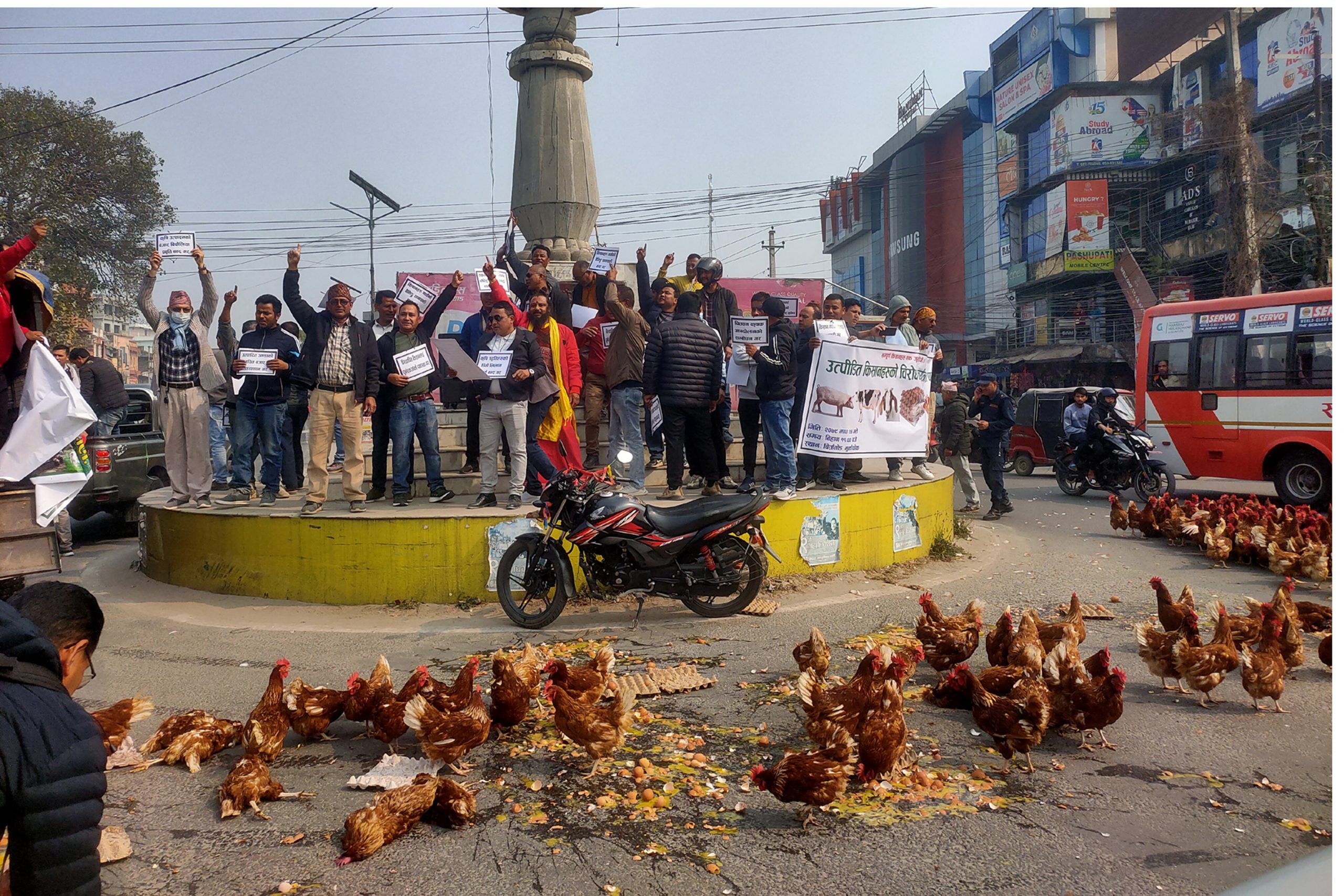 झापामा कुखुरापालक तथा अण्डा उत्पादक किसानले जिउँदो कुखुरा र अण्डा फ्याकेर विरोध प्रदर्शन गरेका छन् । व्यापारबाट बैङ्कको ब्याज समेत तिर्न नसक्ने अवस्था आएको र बारम्बार सम्बन्धित निकायको ध्यानाकर्षण गराउँदा समेत भारतबाट अवैध रूपमा कुखुरा तथा अण्डा आउने क्रम नरोकिएकाले किसानहरु आन्दोलित भएका हुन् ।