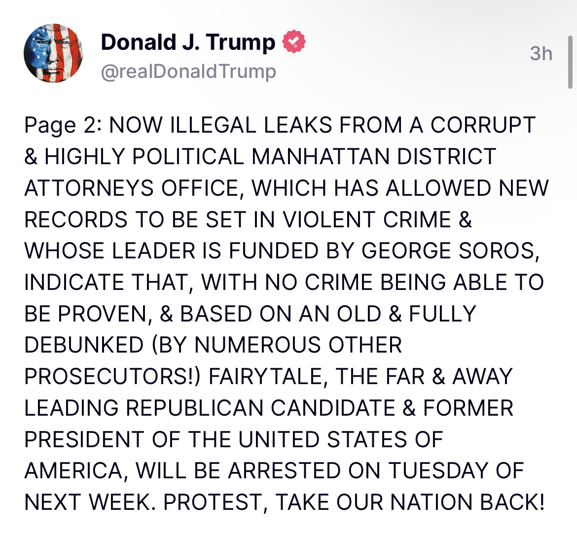 उनलाई विचाराधीन गिरफ्तारीको बारेमा सीधै सूचित गरिएको थियो वा उनले त्यस्ता योजनाहरूको बारेमा कसरी थाहा पाए भन्नेबारे ट्रम्पले केही बताएका छैनन् । तर शनिबार बिहान ट्रुथ सोशल नेटवर्कमा ट्रम्पले अमेरिकाको पूर्व राष्ट्रपतिलाई हप्ताको मंगलबार पक्राउ गरिनेछ भन्ने म्यानहटन डिस्ट्रिक्ट एटोर्नी कार्यालयको गोप्य सर्कुलर उद्धृत गरेका छन् ।