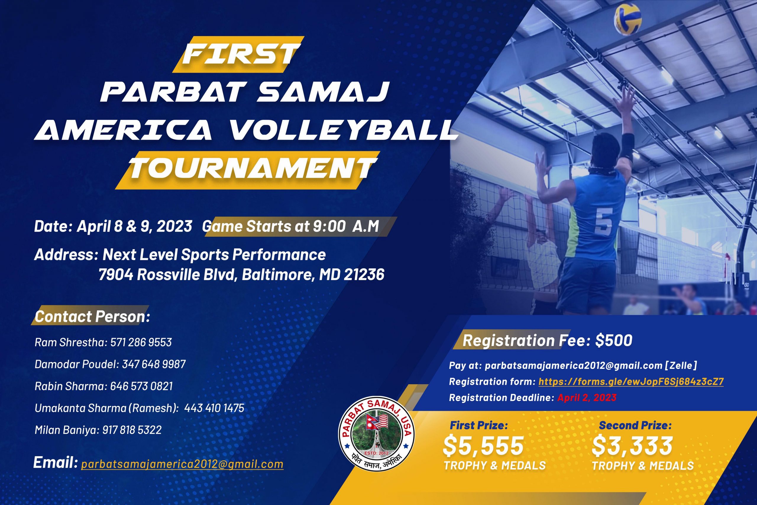 अमेरिकामा नेपालीको अन्तरराज्य स्तरीय भलिवल प्रतियोगिता हुने भएको छ । आगामी अप्रिल ८ र ९ मा मेरिल्याण्डको बाल्टिमोरमा हुने प्रतियोगिता पर्वत समाज अमेरिकाको आयोजनामा हुन लागेको हो ।