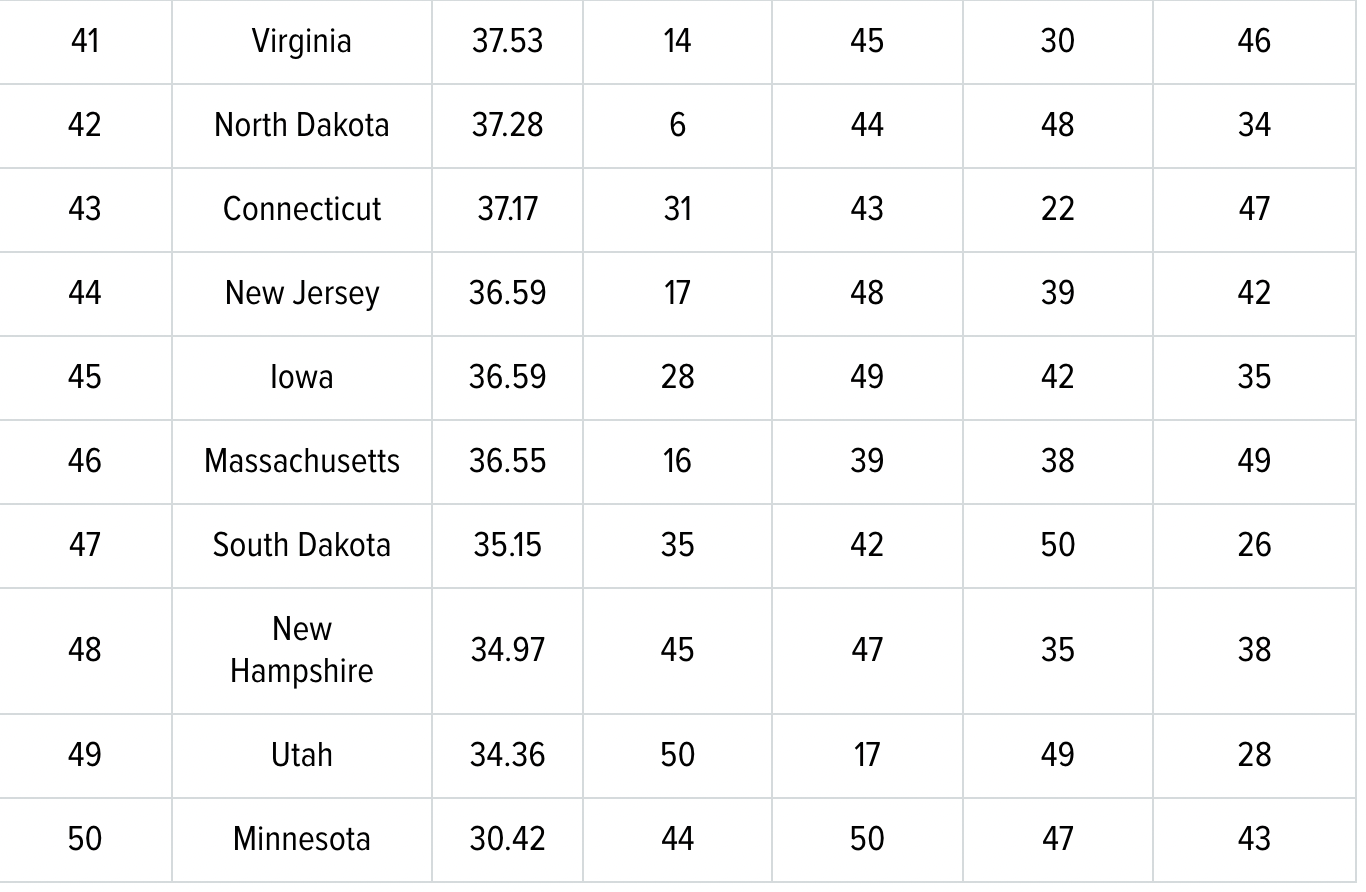 कम तनावग्रस्तमा पहिलो मिनेसोटा, मिनेसोटा, दोश्रो युटाह, तेश्रो न्यू ह्याम्पशायर, चौथो साउथ डकोटा, पाँचौं म्यासाचुसेट्स, छैठौं आयोवा, सातौं नयाँ जर्सी, आठौं कनेक्टिकट, नवौं नर्थ डकोटा र दशौंमा भर्जिनिया रहेका छन् ।