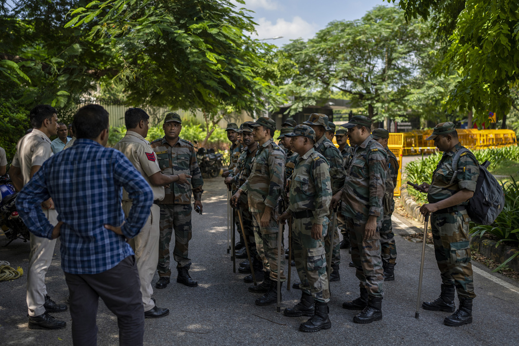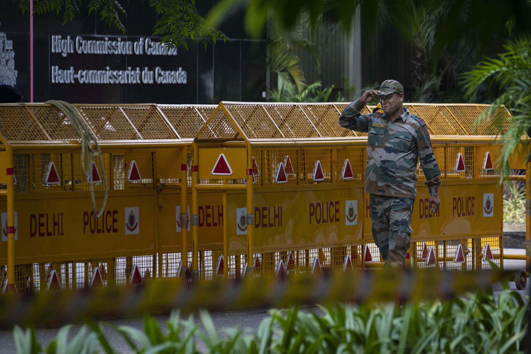 A Delhi police officer briefs a group of Indian paramilitary soldiers outside the Canadian High Commission in New Delhi, India, Tuesday, Sept. 19, 2023. Tensions between India and Canada are high after Prime Minister Justin Trudeau’s government expelled a top Indian diplomat and accused India of having links to the assassination in Canada of Sikh leader Hardeep Singh Nijjar, a strong supporter of an independent Sikh homeland. (AP Photo/Altaf Qadri)