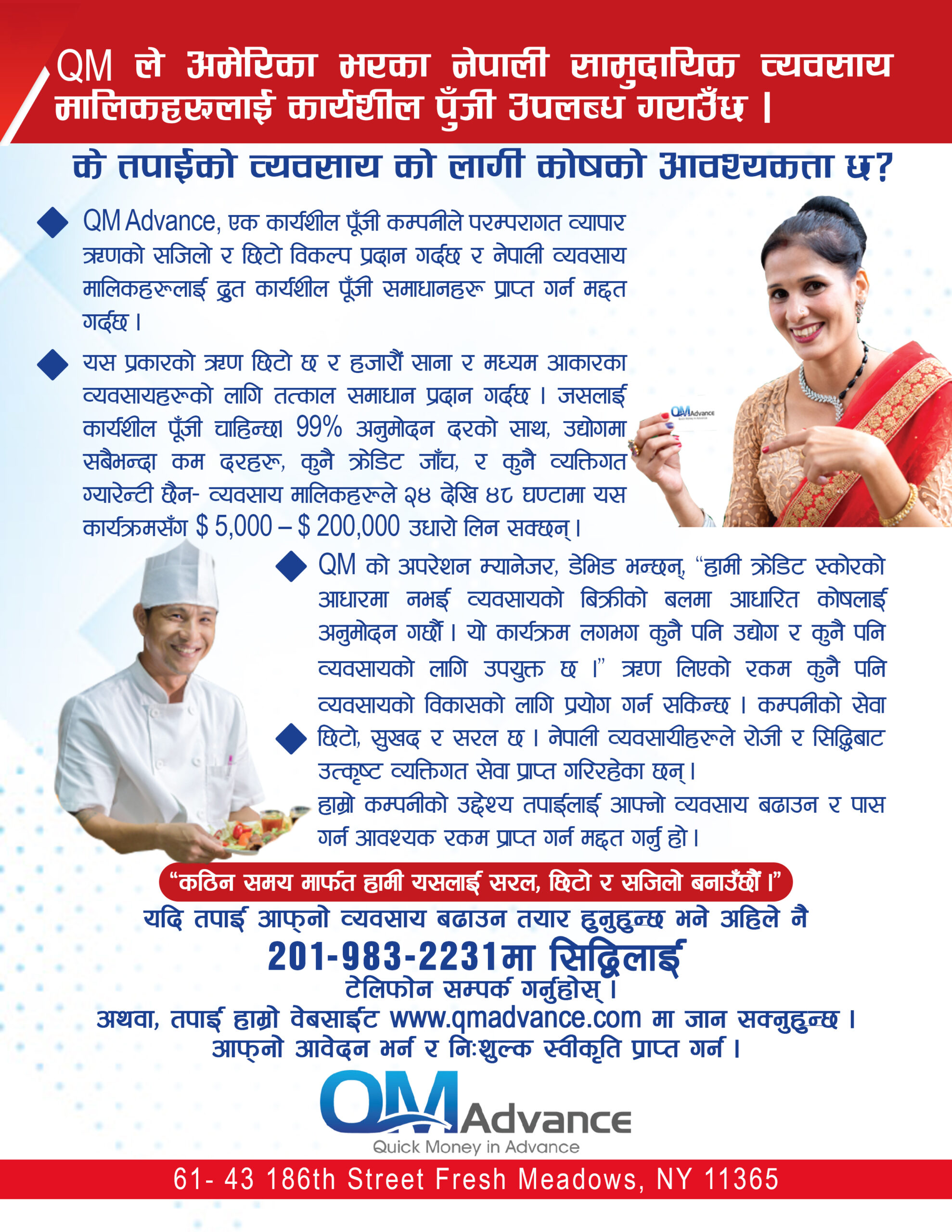 क्युएम एड्भान्सले अब अमेरिकाभरका नेपाली समुदायका व्यवसायलाई विना क्रेडिट जाँच २ लाख डलरसम्म ऋण उपलब्ध गराउने जनाएको छ । अमेरिकाभरका नेपाली समुदायका व्यवसायहरुलाई कार्यशील पूजी उपलब्ध गराउने र त्यसका लागि कुनै व्यक्तिगत ग्यारेन्टी पनि बस्न नपर्ने क्युएम एड्भान्सले जनाएको छ ।