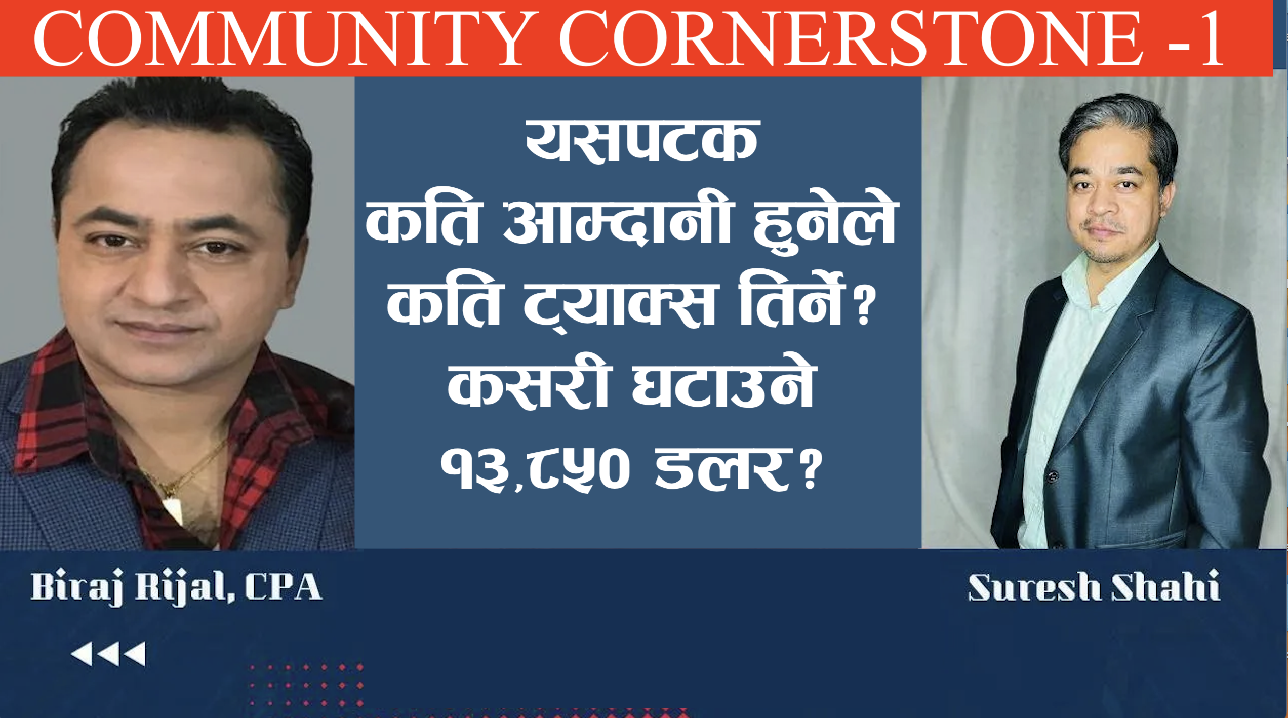अमेरिकामा जनवरी २९ देखि ट्याक्स फाइल सिजन सुरु भइसकेको छ । यसपटक कति आम्दानी हुनेले कति ट्याक्स तिर्नुपर्छ? कति आम्दानी हुनेहरुले ट्याक्स फाइल गर्नुपर्छ? स्ट्याण्डर्ड डिडक्सनमार्फत करयोग्य कति आम्दानी घटाउन सकिन्छ? पेपल लगायतका एप्लीकेशनबाट गरेको आम्दानी रिपोर्ट गर्नुपर्छ कि पर्दैन? उपहारबाट पाएको रकम र अन्य आम्दानीमा ट्याक्सको नियम के फरक छ ? आईआरएसको फन्दामा नपर्न ध्यान दिनैपर्ने कुराहरु के कस्ता छन् ? अमेरिकाको न्युयोर्क निवासी सीपीएस विराज रिजालसँग कम्युनिटी कर्नरस्टोनको पहिलो श्रृंखलामा खसोखास सम्पादक सुरेश शाहीले गरेको कुराकानी । यो पडकास्ट स्पटीफाई र अमेजन पडकास्टमा पनि सुन्न सकिन्छ ।