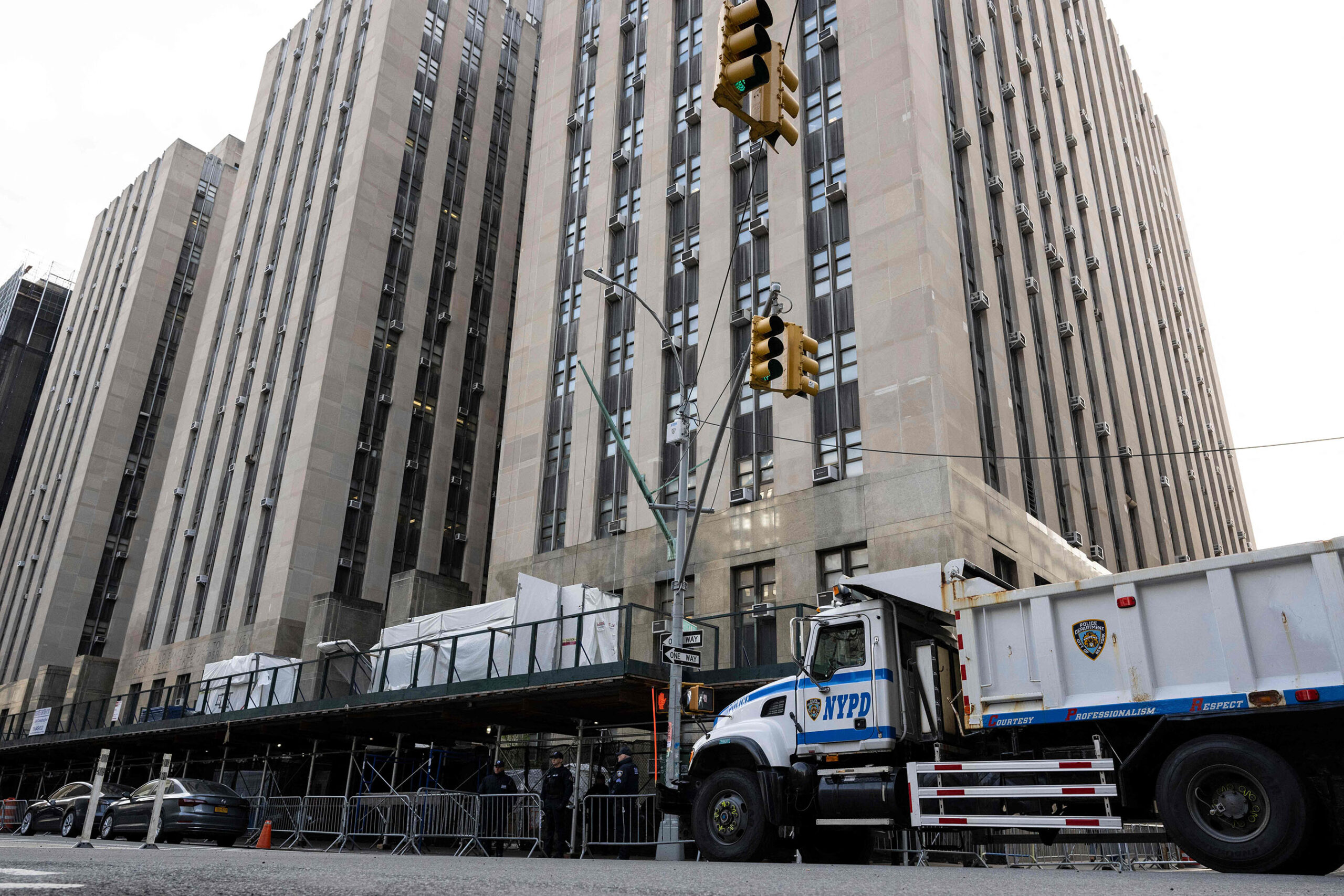New York police guard the Manhattan Criminal Court in New York City where former US President Donald Trump is attending his trial for allegedly covering up hush money payments linked to extramarital affairs, on April 19, 2024. A panel of 12 jurors was sworn in on April 18, 2024, for the unprecedented criminal trial of a former US president. (Photo by ANGELA WEISS / AFP)