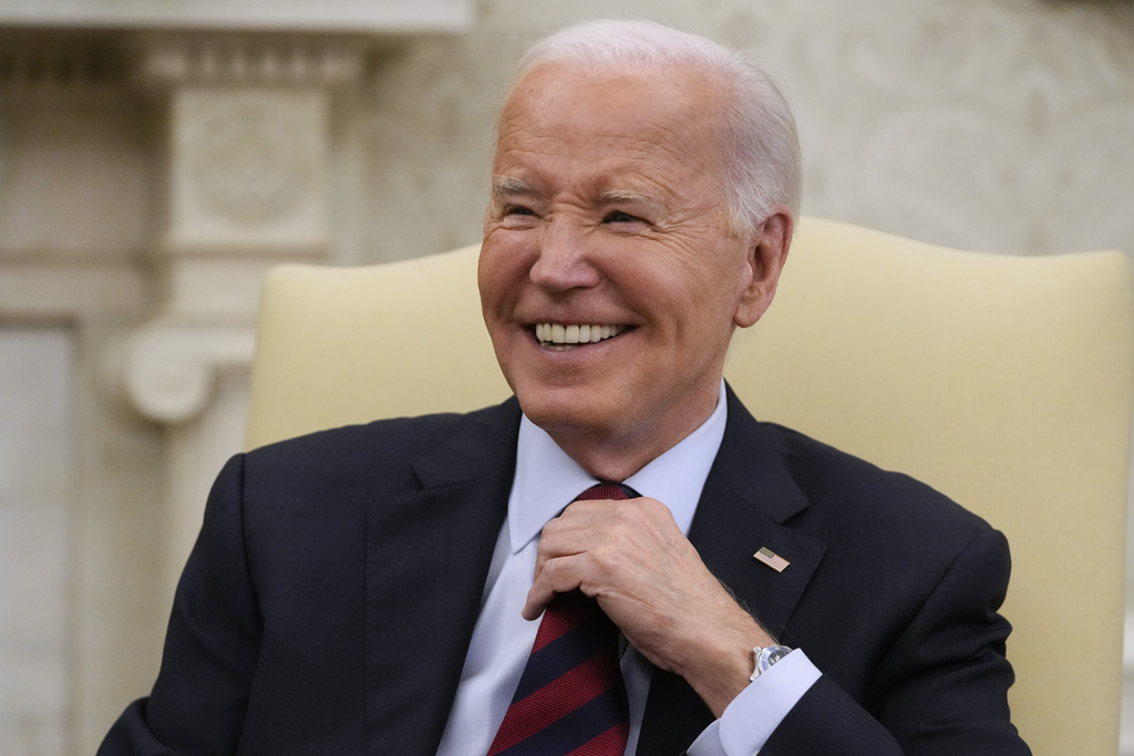 President Joe Biden smiles as he meets with NATO Secretary General Jens Stoltenberg in the Oval Office at the White House, Monday, June 17, 2024. (AP Photo/Mark Schiefelbein)