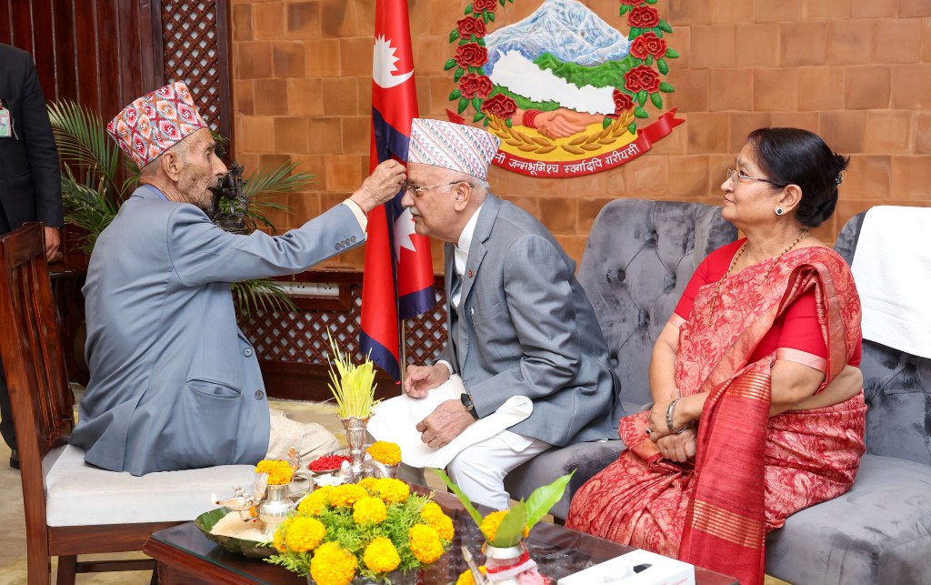 प्रधानमन्त्री ओलीद्वारा बुबाको हातबाट विजयादशमीको टीका ग्रहण