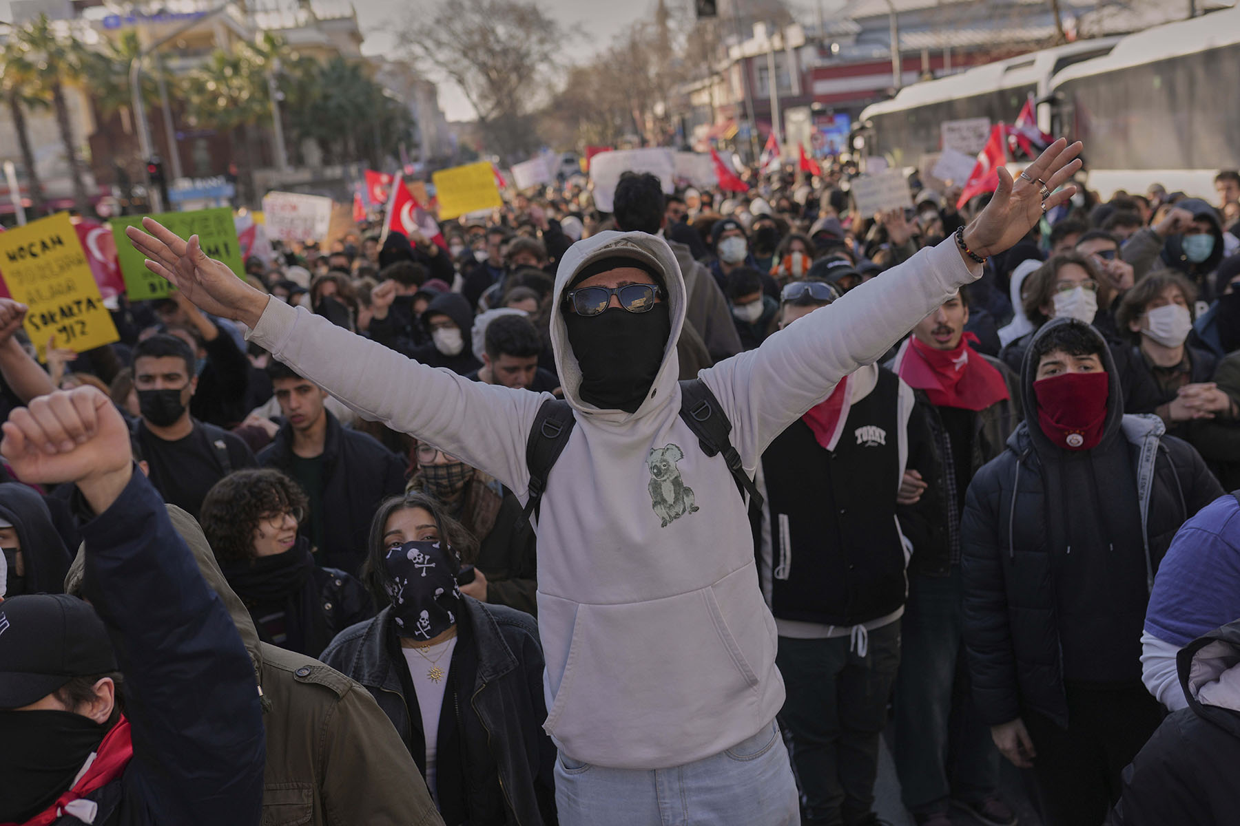 University students shout slogans in Istanbul, Turkey, Friday, March 21, 2025, as they protest against the arrest of Istanbul’s Mayor Ekrem Imamoglu. (AP Photo/Francisco Seco)