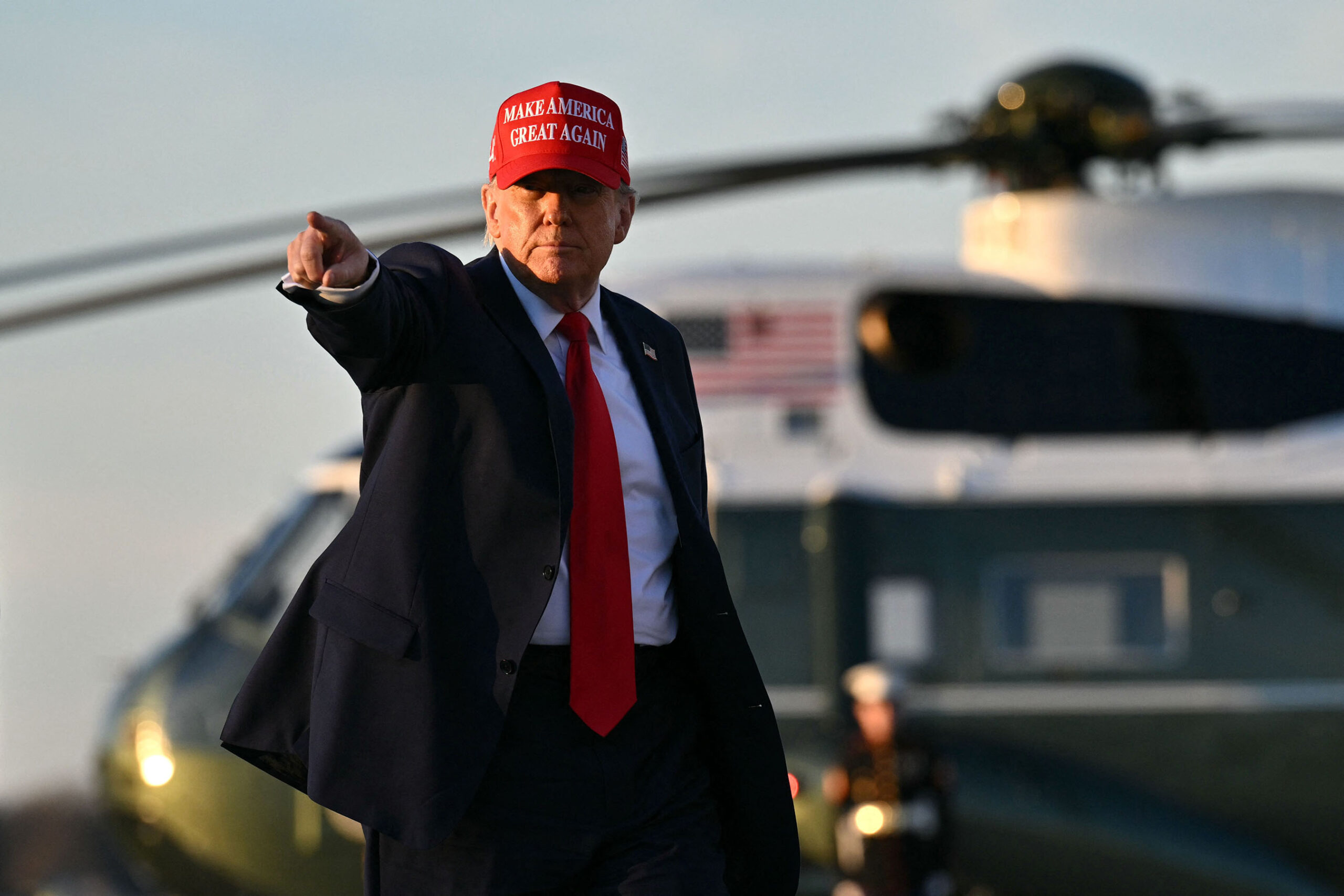 TOPSHOT – US President Donald Trump points to a television crew as he walks to board Air Force One as he departs Joint Base Andrews in Maryland on February 28, 2025, en route to his Mar-a-Lago resort in Palm Beach, Florida. (Photo by ROBERTO SCHMIDT / AFP)