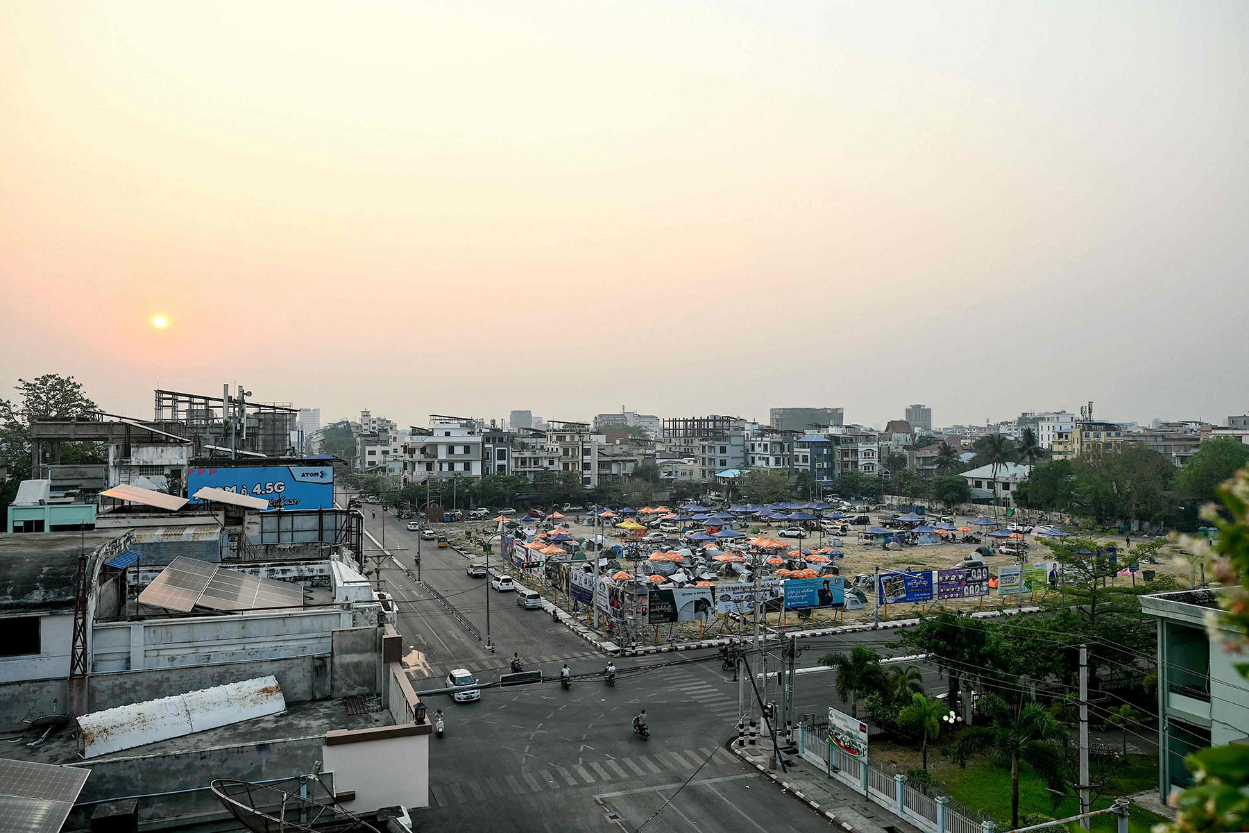 This general view shows a makeshift tent camp set up for displaced residents in Mandalay on April 1, 2025, a few days after the deadly Myanmar earthquake. After a night sprawled out on cardboard panels under hastily erected plastic tarps, hundreds of Mandalay residents arose to another day of earthquake recovery, wondering when they can return safely to permanent shelter. (Photo by Sai Aung MAIN / AFP)