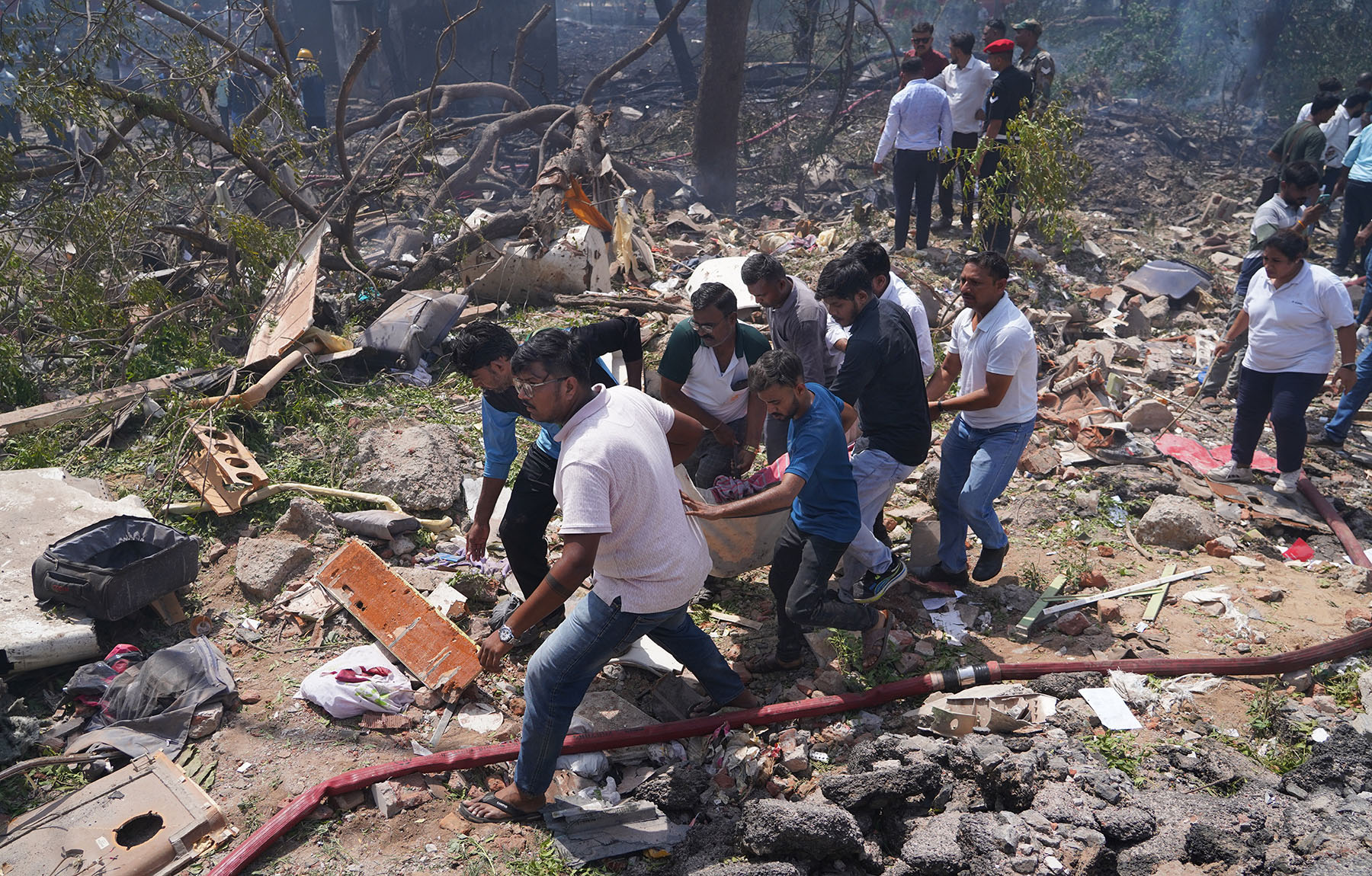 (250612) — AHMEDABAD, June 12, 2025 (Xinhua) — Rescuers carry the body of a victim at the site of an Air India plane crash in Ahmedabad of India’s Gujarat state, June 12, 2025. India’s foreign ministry said a lot of people have lost their lives in the plane crash with 242 people on board the flight to London in the western state of Gujarat. (Str/Xinhua)
