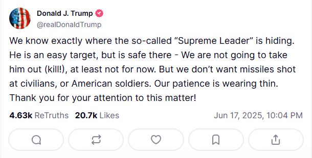 ट्रम्पले ट्रुथ सोसलमा लेख्दै भने, “हामीलाई ठ्याक्कै थाहा छ कि आयातोल्ला अली खामेनी कहाँ लुकेका छन्।” तर, उनले थपे, “हामी उनलाई बाहिर निकाल्ने (मार्ने!) छैनौं, कम्तिमा अहिलेको लागि।”