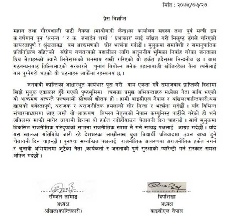 वाईसीएल अध्यक्ष रामप्रसाद सापकोटा ‘दिपशिखा’ र अखिल क्रान्तिकारीका अध्यक्ष रञ्जित तामाङले सोमबार संयुक्त विज्ञप्ति जारी गरेर माओवादी नेताहरु वर्षमान पुन र जनार्दन शर्मालाई लक्षित गरेर भएको आक्रमणको भर्तसना गरेका छन् ।