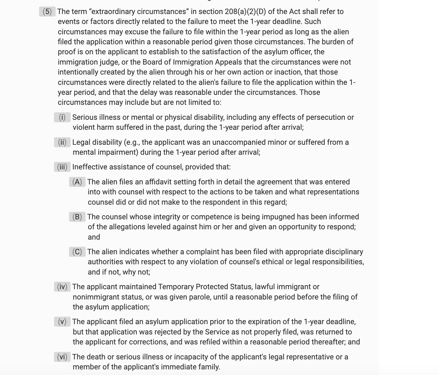 हालको नियमहरूले शरणार्थीहरूलाई आवेदन फाइल गर्नको लागि उनीहरूको आगमन मितिबाट सामान्यतया एक वर्षको समय दिइएको छ। यद्यपि असाधारण परिस्थितिहरू सामना गर्ने व्यक्तिहरूको लागि अपवादहरू रहेका छन् । टीपीएसलाई पनि असाधारण अवस्थाका रुपमा स्वीकार गरिने संघीय नियमहरूको कोडमा उल्लेख छ ।
