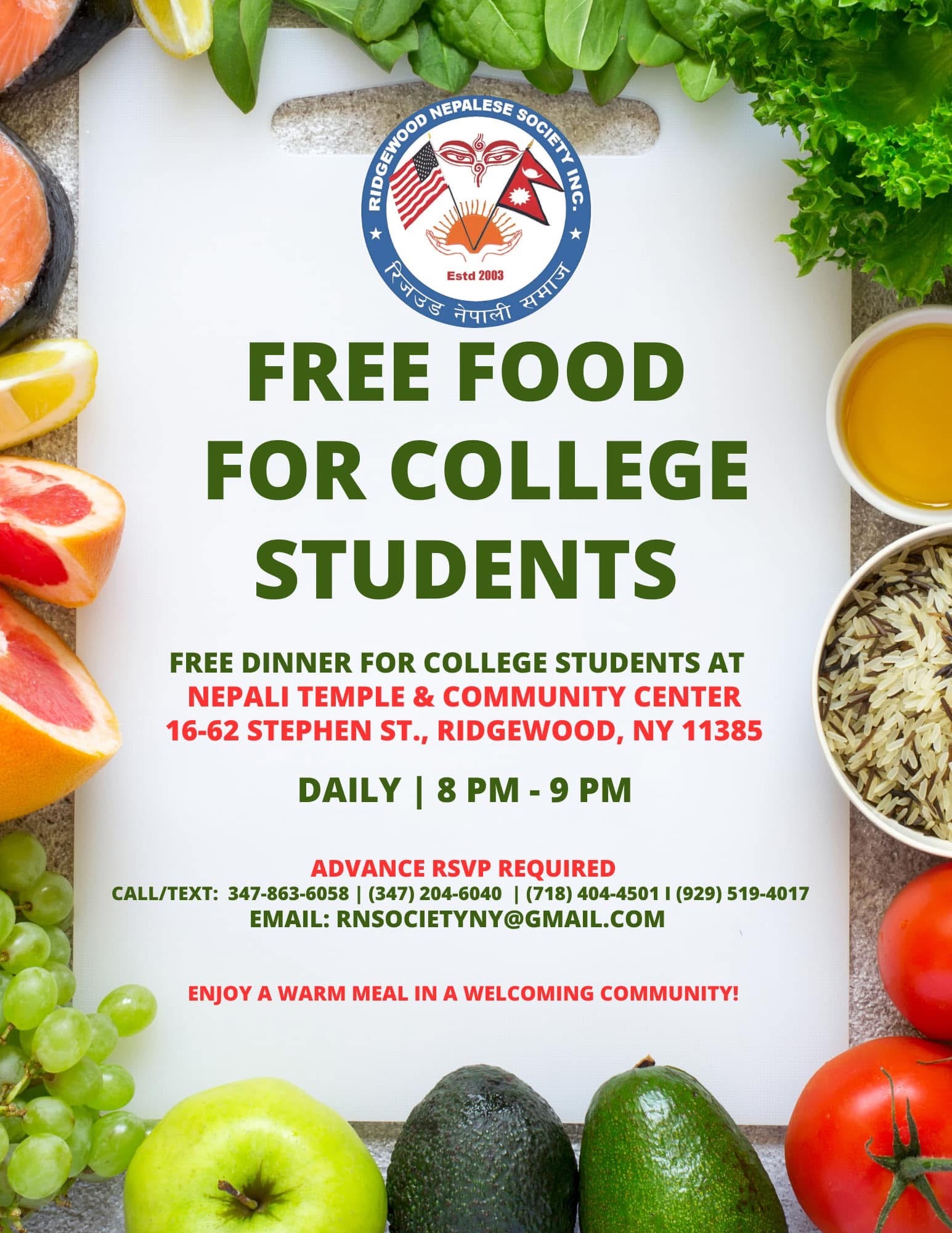 निःशुल्क खाना प्रतिदिन बेलुका ८ बजे देखि ९ बजेसम्म उपलब्ध छ र विद्यार्थीहरूले अग्रिम रूपमा ३४७-८६३-६०५८, (३४७) २०४-६०४०, (७१८) ४०४-४५०१, वा (९२९) ५१९-४०१७ नम्बरहरूमा फोन वा मेसेज गरेर आरएसभिपी गर्नुपर्छ । एक महिना सञ्चालन हुने यो कार्यक्रमले पहिले नै सकारात्मक प्रतिक्रिया पाएको छ। आयोजकहरूले सामुदायिक आवश्यकता र प्रतिक्रियाको आधारमा यस कार्यक्रमलाई अगाडि बढाउने विचार गरिरहेका छन्।
