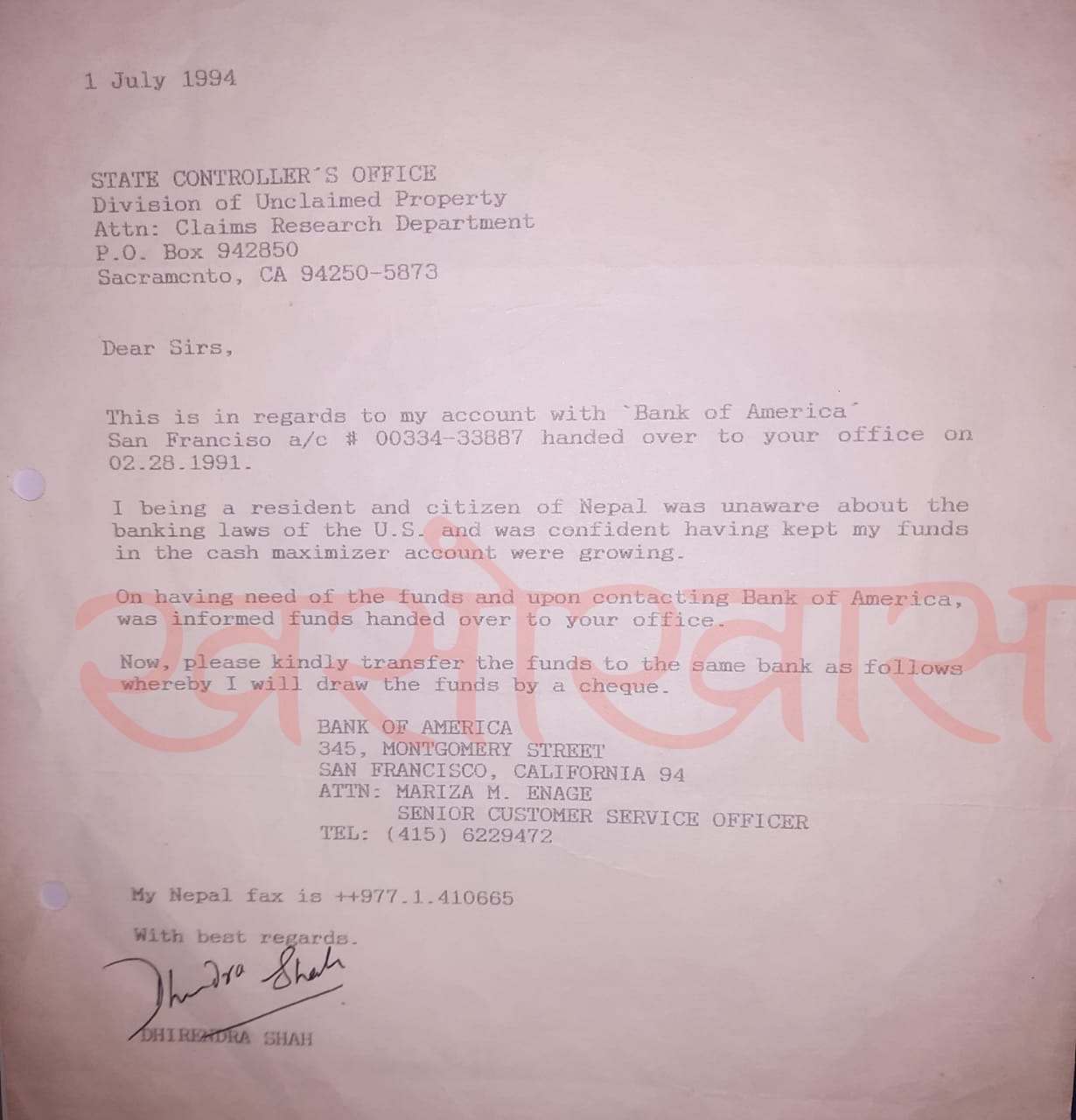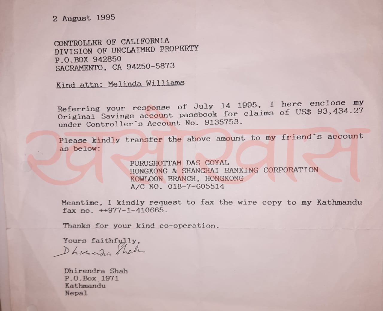 त्यसपछि शाहले २ अगस्त १९९५ मा आफ्नो पासबुकको प्रतिलिपी समेत समावेश गरेर रकम दावी गर्दै राज्य कन्ट्रोलरको कार्यालयमा पत्र पठाएका थिए । उनले त्यतीबेला हङकङमा रहेका आफ्ना साथी पुरुषोत्तम दास गोयलको हङकङको खातामा रकम पठाउन अनुरोध गर्दै त्यसको रेकर्ड आफ्नो फ्याक्स नम्बर ९७७ १ ४१०६६५ पठाउन कन्ट्रोलरलाई जानकारी गराएका थिए ।