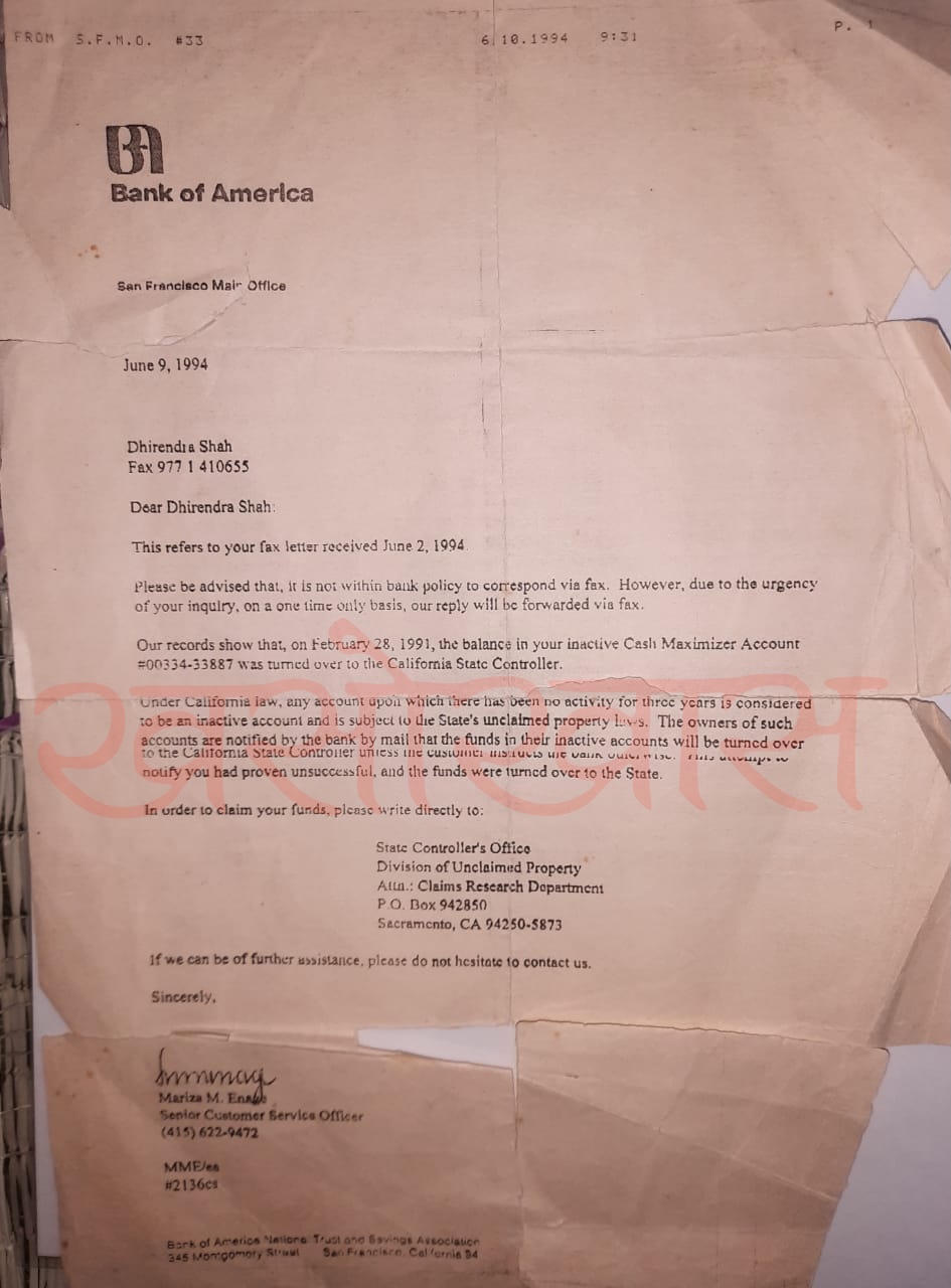 त्यसपछि बैंक अफ अमेरिकाले उनलाई सन् १९९४ को जुन ९ मा फ्याक्सको जवाफ पठाएको थियो । फ्याक्समार्फत जवाफ दिने बैंकको नीति नभएपनि अत्यावश्यक अवस्थालाई मध्यनजर गर्दै एकपटकका लागि फ्याक्स मार्फत नै जवाफ पठाएको उल्लेख गर्दै बैंकले खाता बन्द गरेर क्यालिफोर्निया राज्य कन्ट्रोलरमा रिपोर्ट गरिएको बताएको थियो । बैंकको रेकर्ड अनुशार सन् १९९१ को फरबरी २८ मा बैंक अफ अमेरिकाले खाता बन्द गरेर कन्ट्रोलर समक्ष रिपोर्ट गरेको थियो ।